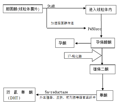 在膽固醇到睪酮的轉(zhuǎn)化過程中, 主要涉及到以上圖中的幾個步驟。 注意:在Leydig 細胞睪酮生物合成的調(diào)節(jié)因素中, 任何因素只要可以影響睪酮生物合成的任一環(huán)節(jié), 即可最終引起睪酮合成的變化。